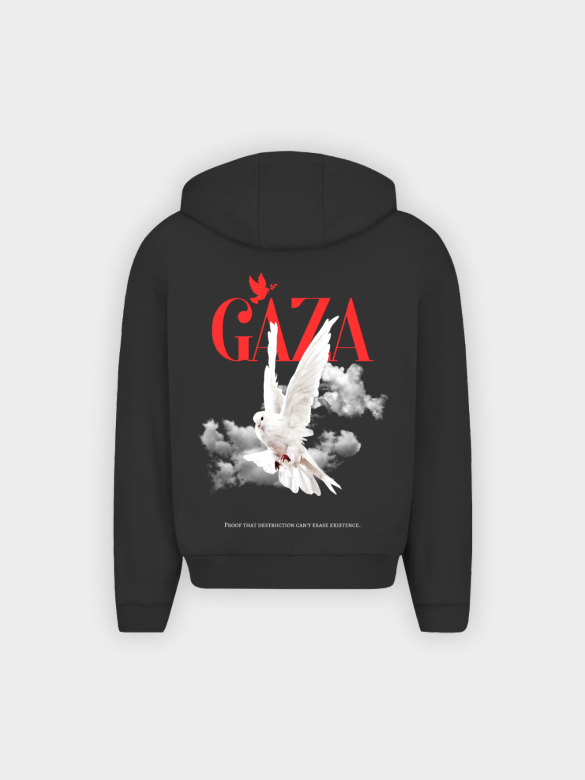 Vorne schlicht mit der roten BALADI-Taube als Symbol der Hoffnung, hinten das eindrucksvolle Dove-Design über Gaza – ein Motiv, das zeigt, dass Zerstörung niemals Existenz auslöschen kann.